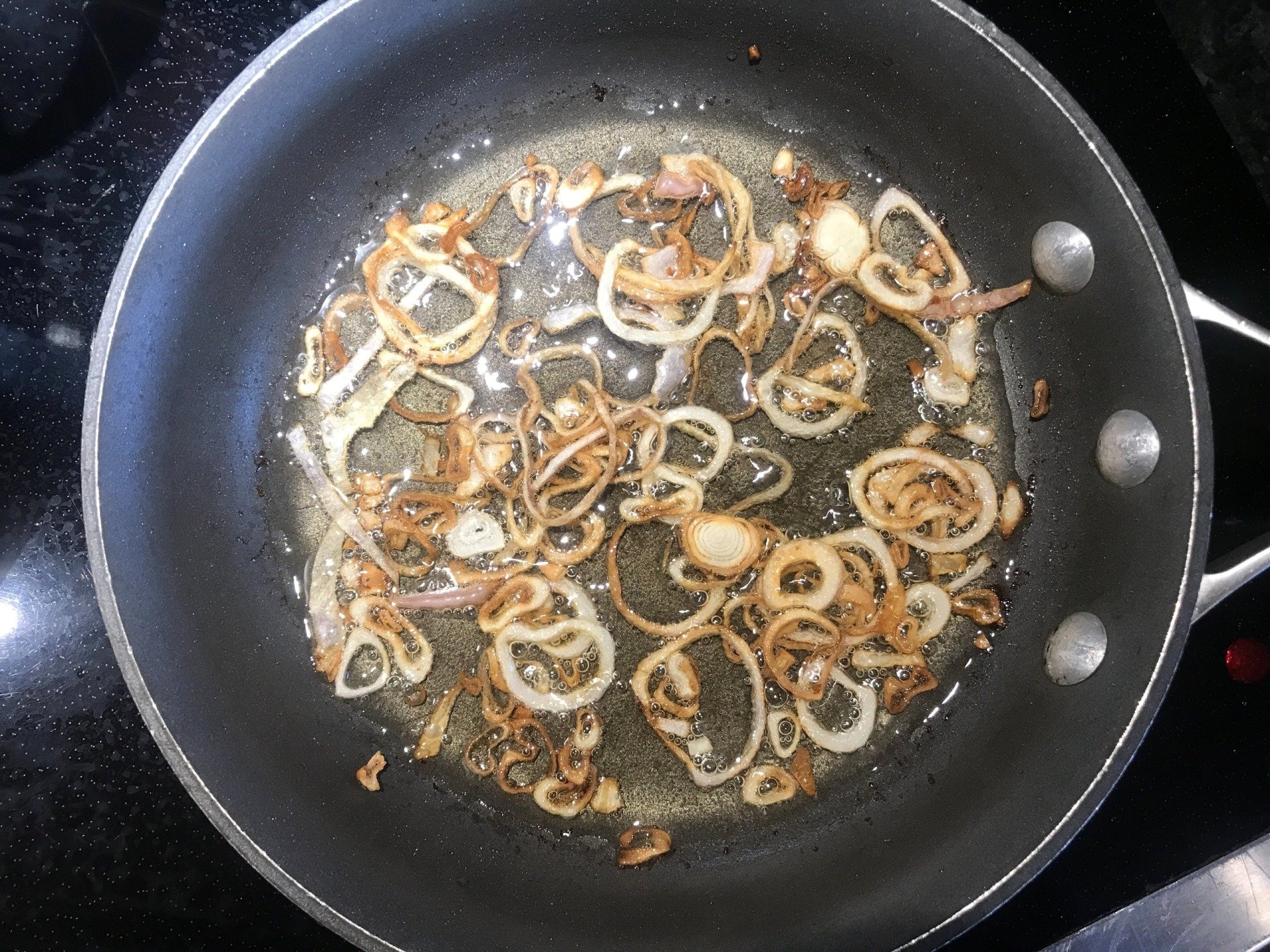 I originally saw this recipe in the October 2012 issue of Food & Wine magazine. I learned the Burmese will make this simple dish and serve it for breakfast. The dish is truly simple to make and you just have to be careful you don't burn the shallots, because the oil gets hot fast. Overall, the dish was very good and quick to make, especially in my favorite Scanpan from FEAST Cooking Shop