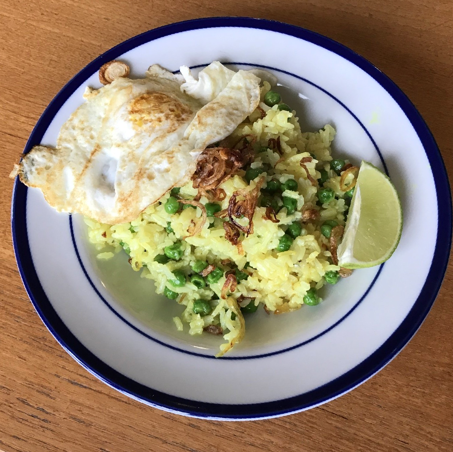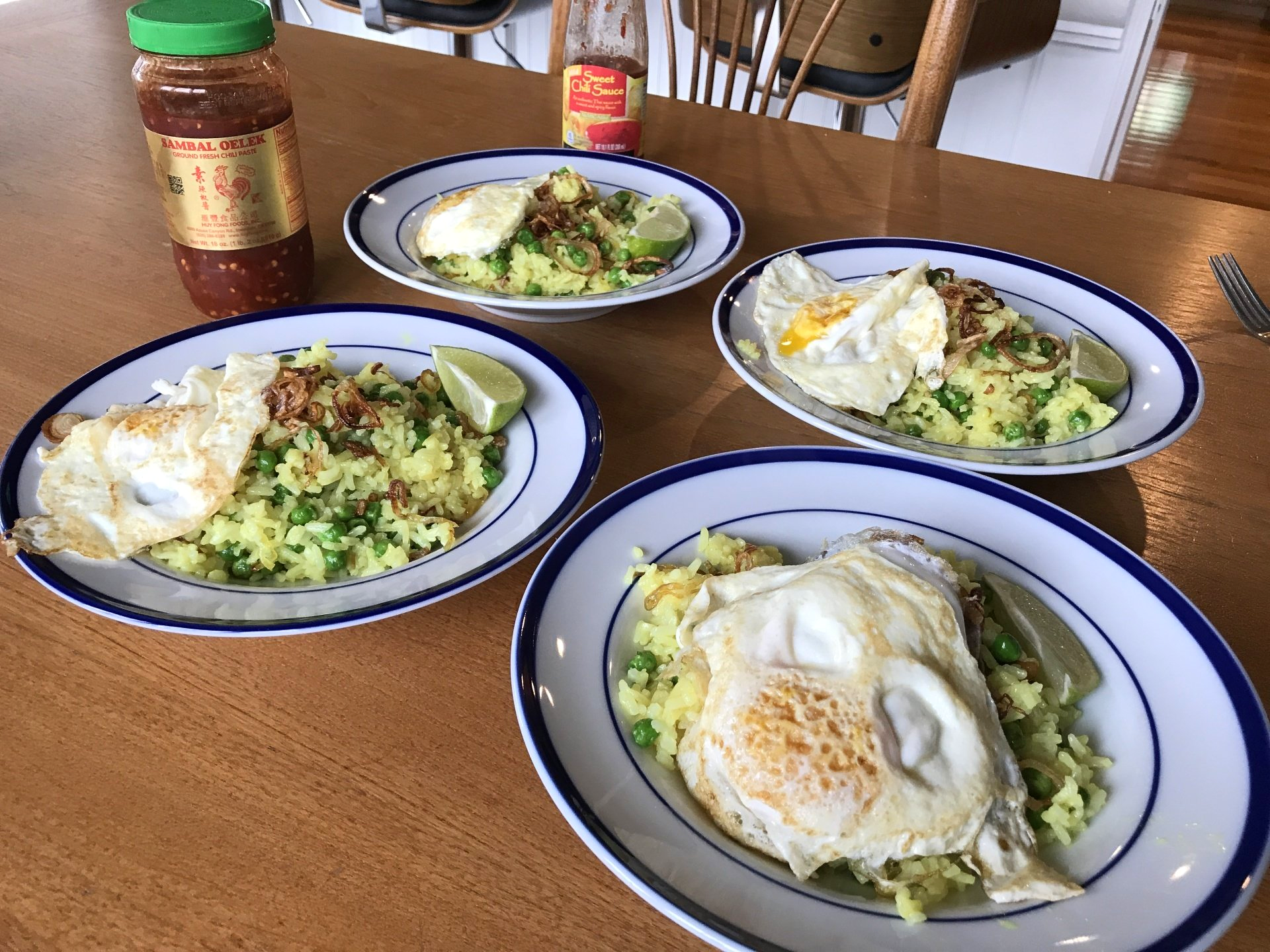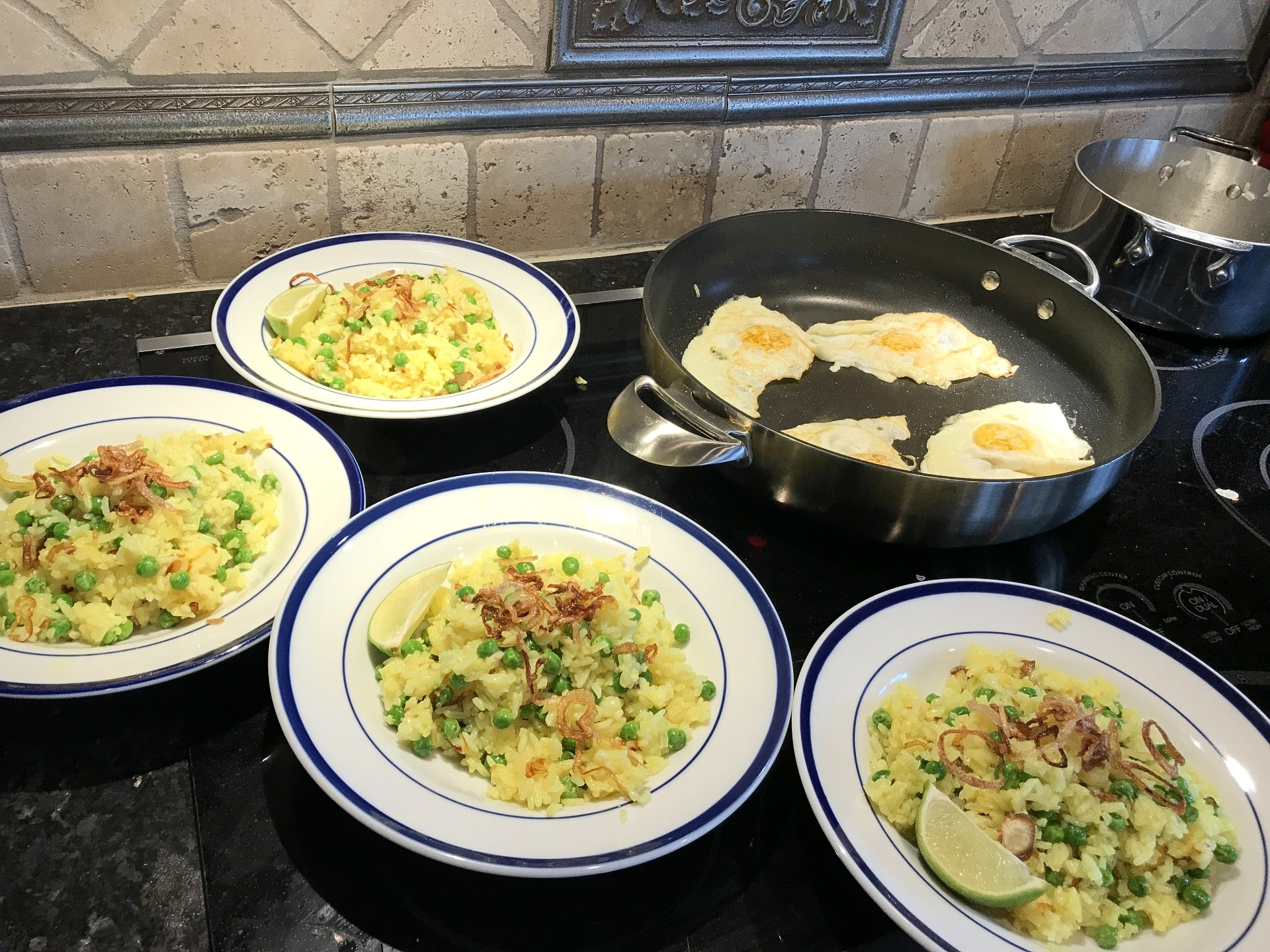 - Add some butter to the pan and fry four eggs over easy, place eggs on top of rice. Serve with lime wedges and chili sauce.