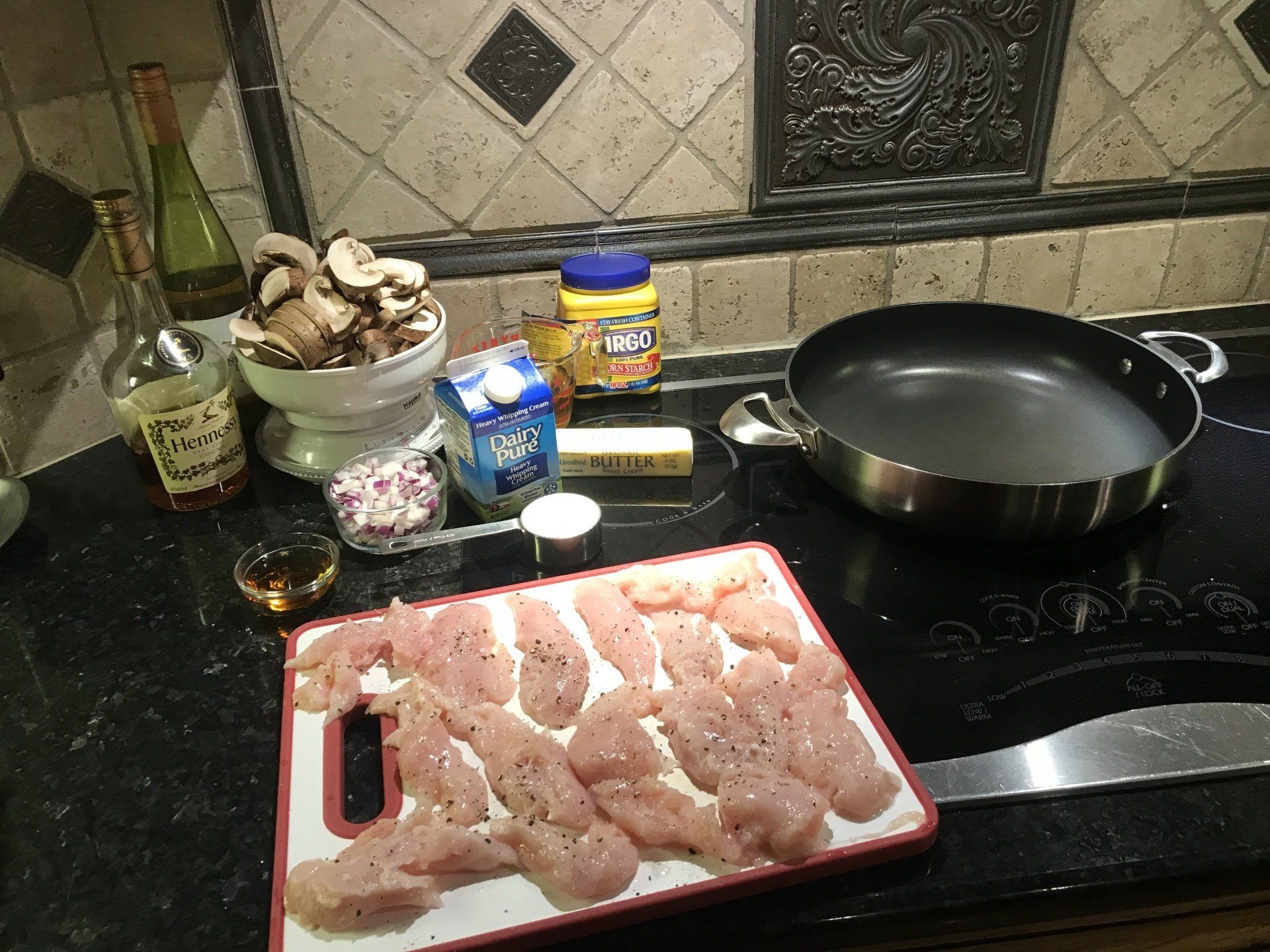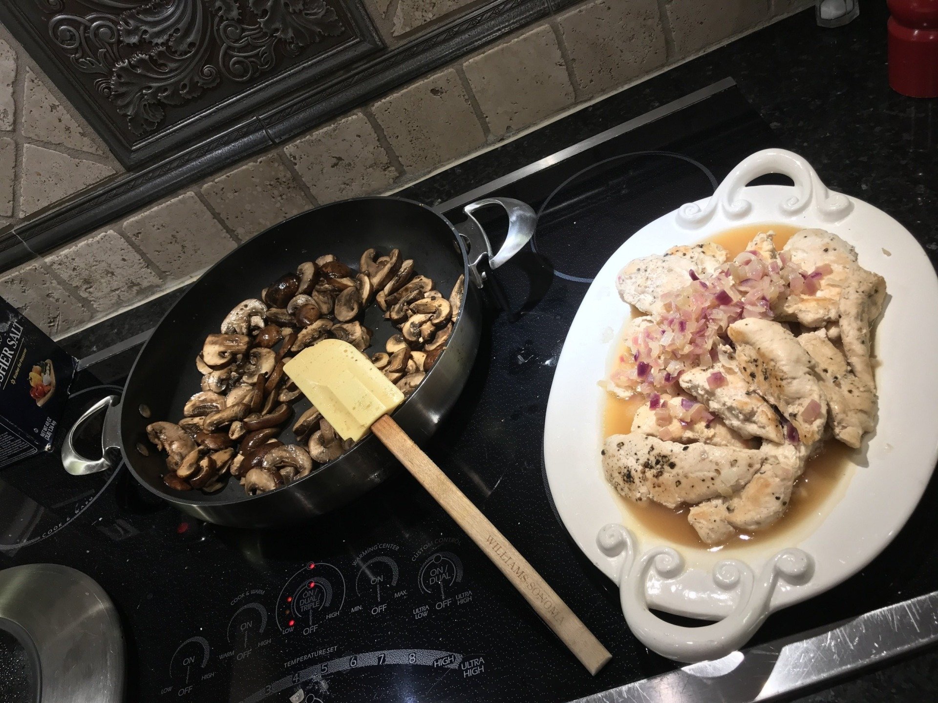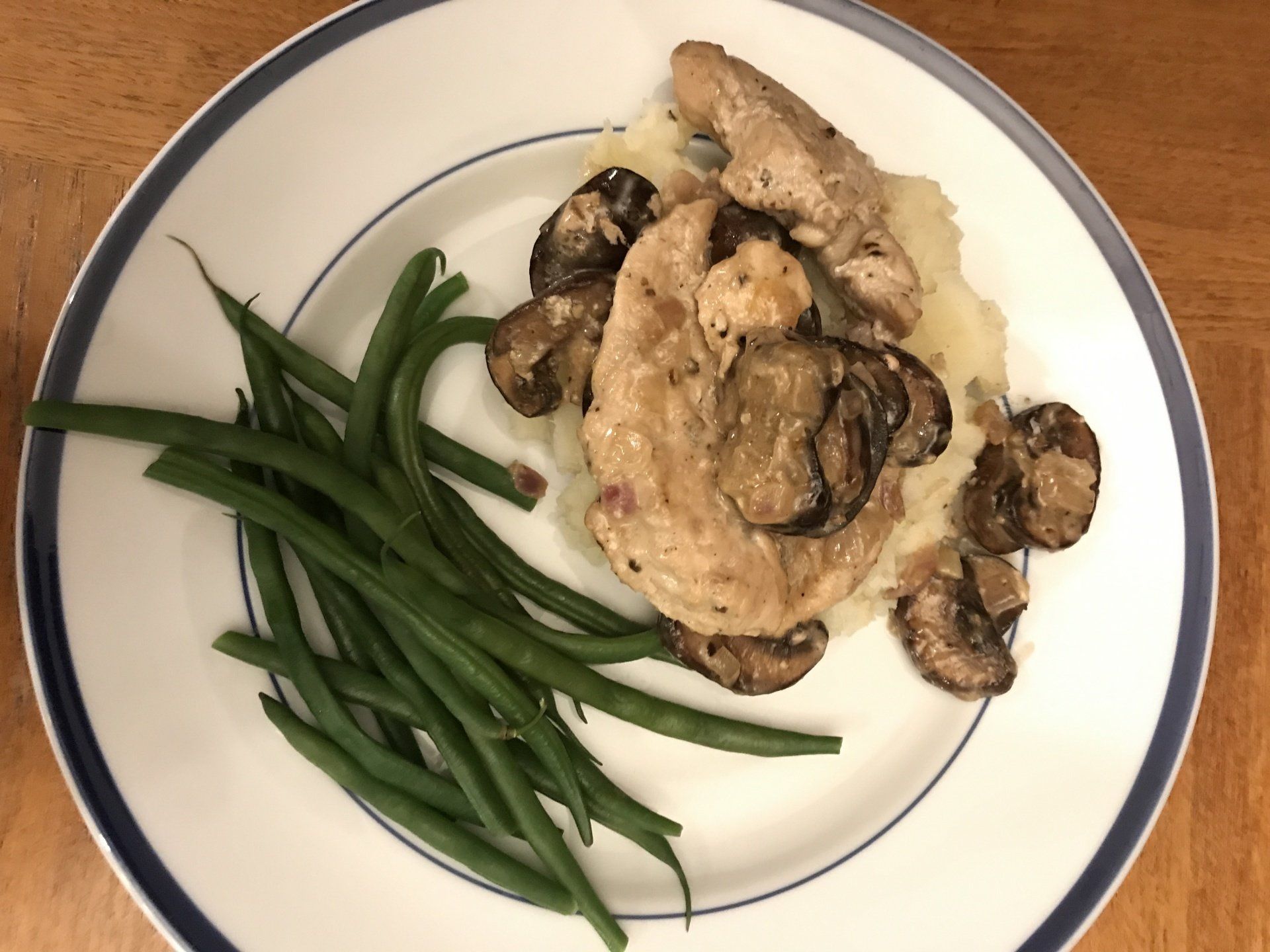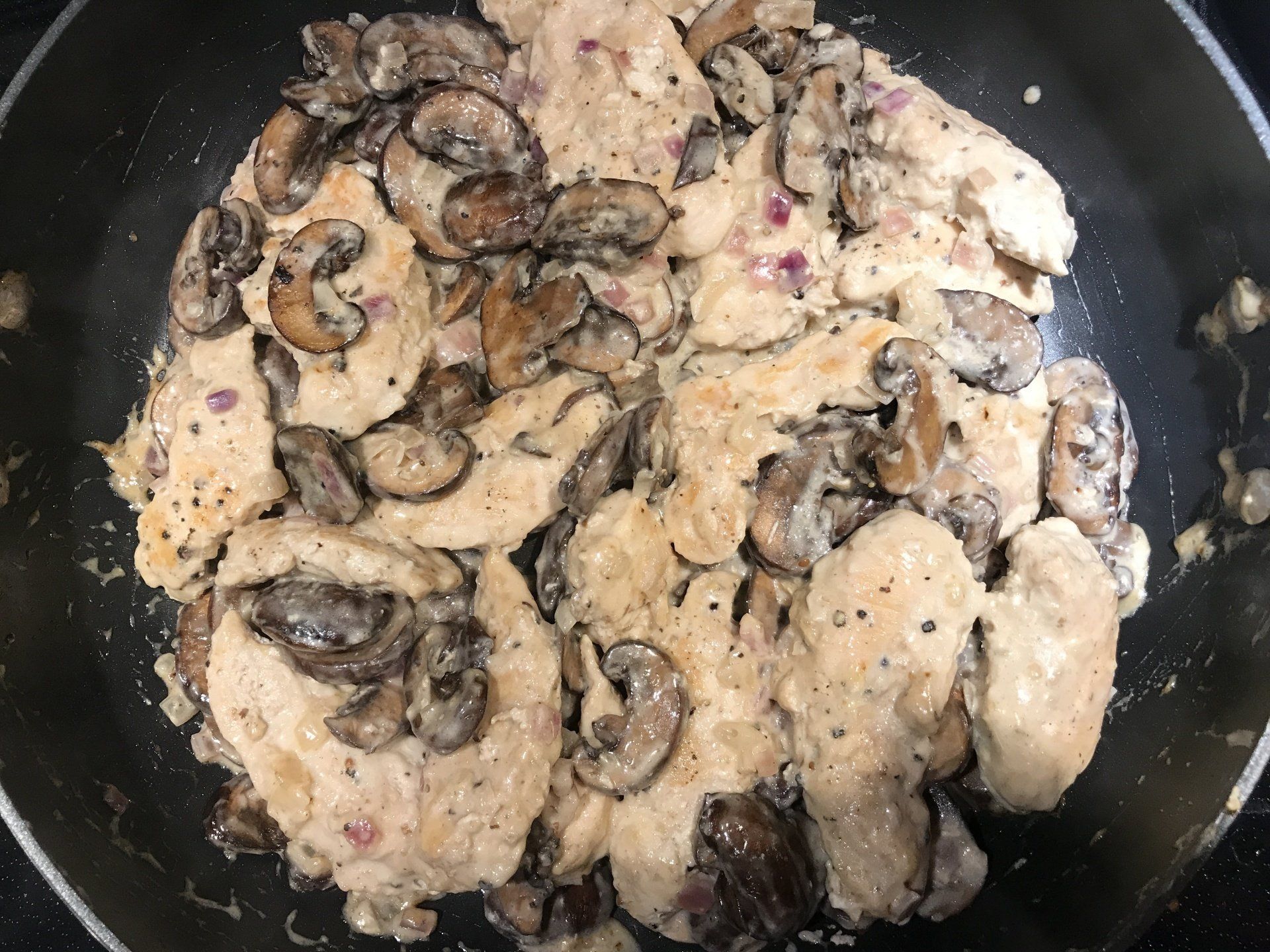 - In a bowl, blend the flour and the remaining 1 tablespoon of butter. Pour the chicken, shallot and wine juice back into the pan. Stir in the cream and bring to a simmer. Gradually whisk the flour paste into the cooking liquid and simmer, whisking, until no floury taste remains, 3 minutes. Season with salt and pepper. Return the chicken to the skillet, add the mushrooms and briefly reheat.