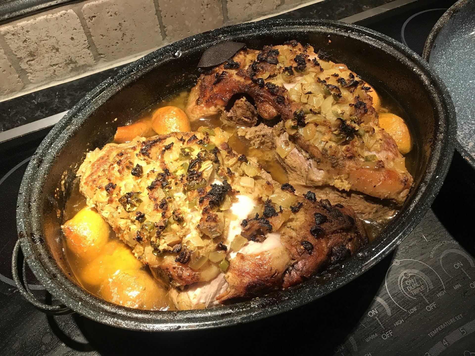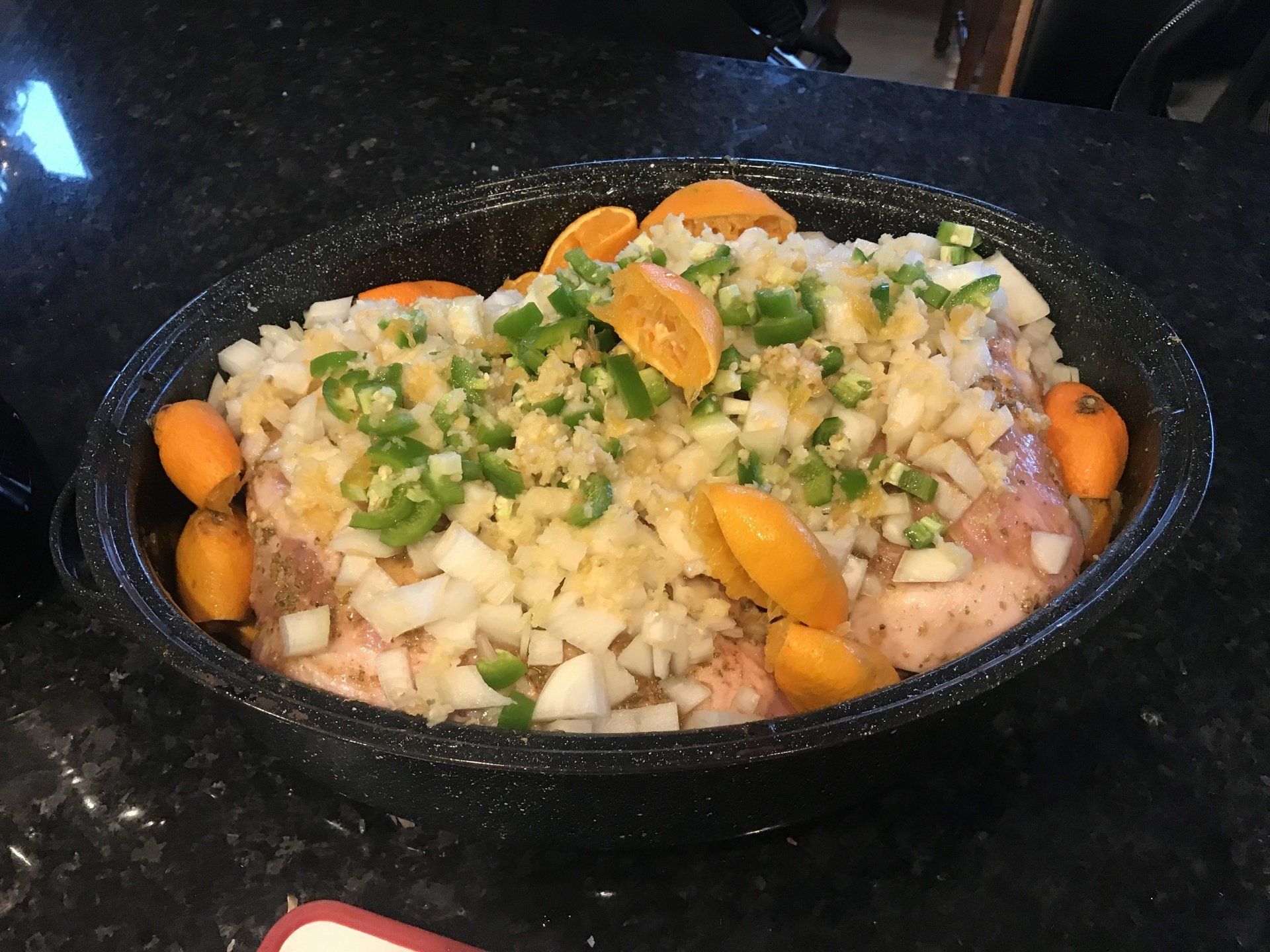 - Mix the oregano and the cumin with olive oil and rub all over pork.