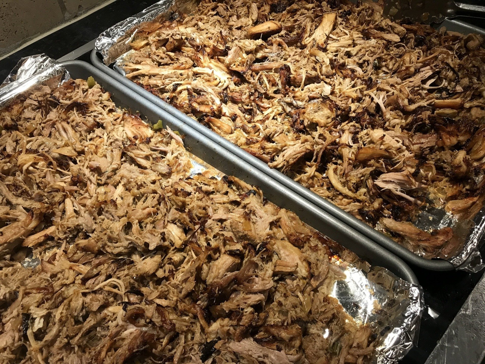 - Spread pork out in a large deep baking pan with all of the juice, place under broiler until all the juice is evaporated and meat becomes crispy. Stir every 3-5 minutes for about 50 minutes.