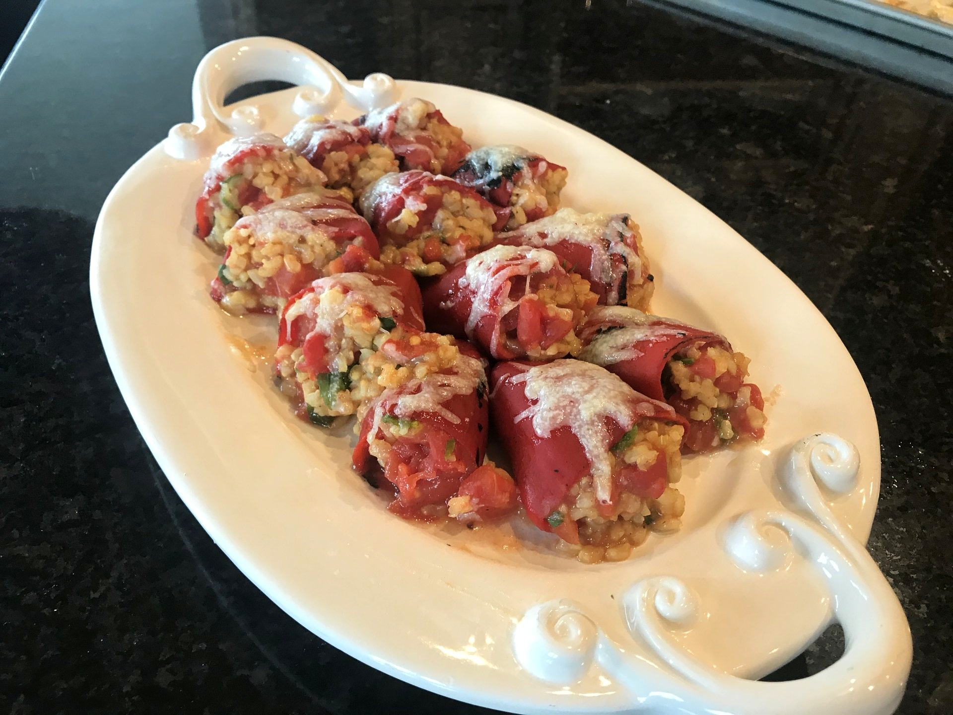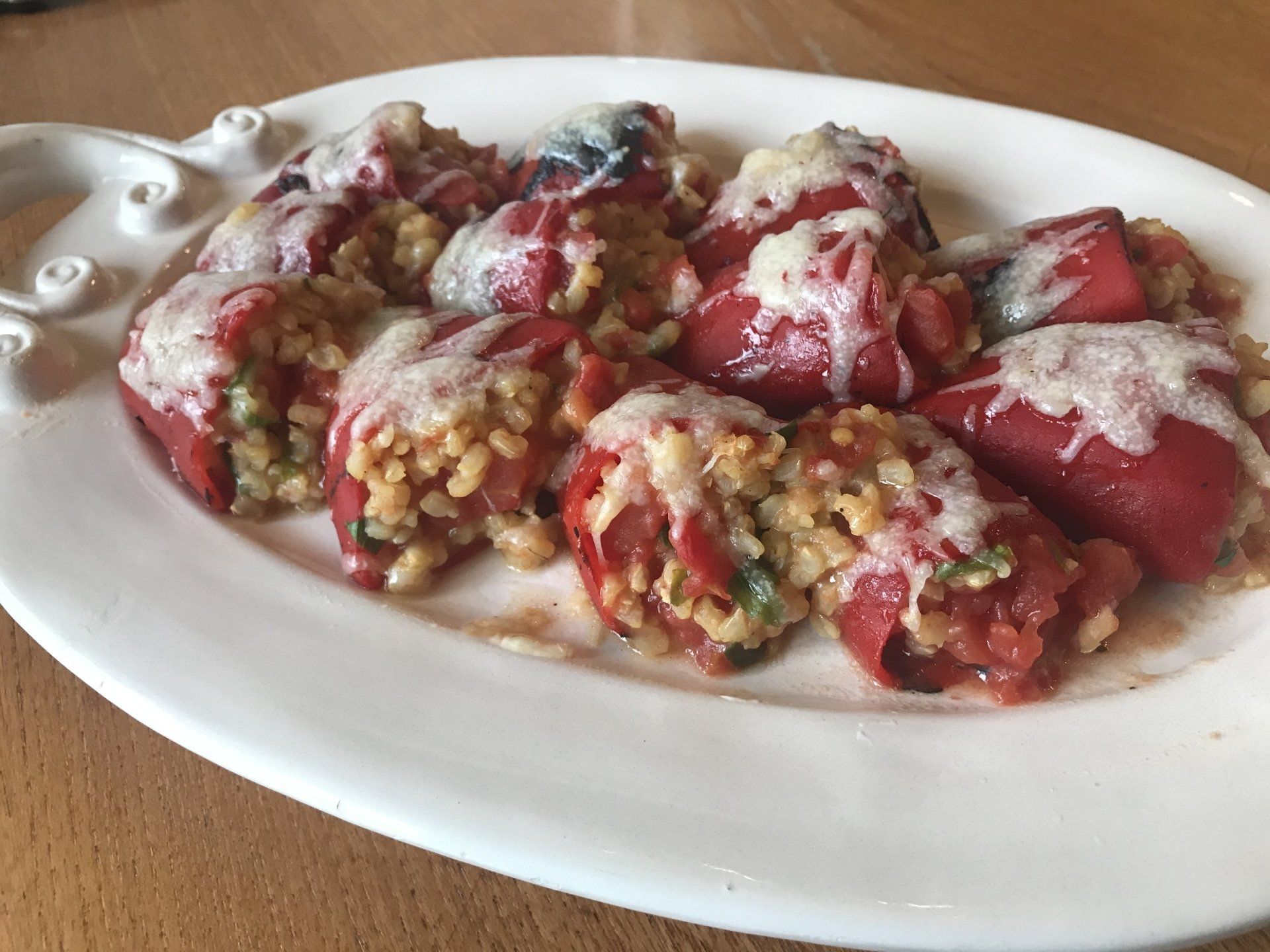 - Spoon about 3 tablespoons rice mixture into each piquillo pepper. Place stuffed peppers on parchment paper on a jellyroll pan. Sprinkle evenly with Manchego cheese. Bake at 400° for 10 minutes or until peppers are thoroughly heated. Garnish with parsley sprigs, if desired.