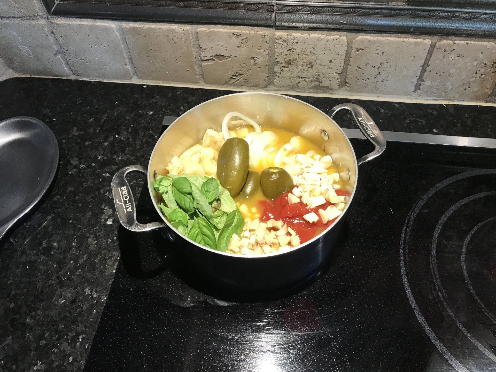 In a medium saucepan, combine the bananas with the vegetable stock, onion, water, pickled jalapeño, garlic and ginger and bring to a boil. (I misread the recipe so I included 1 cup ketchup, basil and pickling liquid in the boiling pot.) Simmer over moderate heat, stirring, until the bananas and onion are very tender, 15 minutes. Transfer to a blender and let cool slightly. Add an additional 1/2 cup of ketchup. Scrape the banana ketchup into a bowl and season with salt and pepper. Cover and refrigerate until chilled, about 30 minutes.
