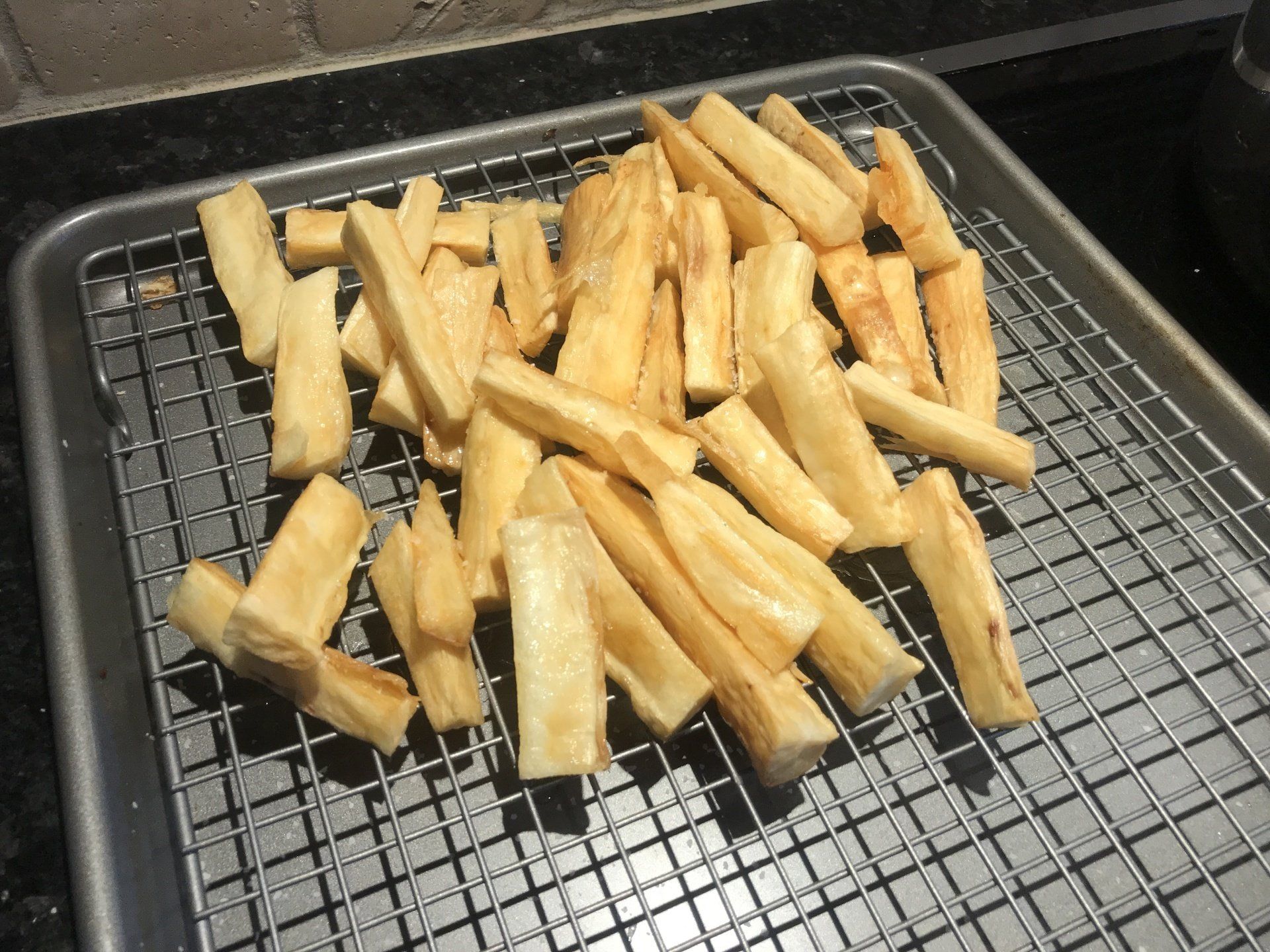 Bring a large saucepan of salted water to a boil. Peel the yucca and cut into 3-inch lengths. Cut the lengths into 1/2-inch-thick wedges. Cook the yucca in the boiling water until tender, 10 to 15 minutes. Drain well and spread on a baking sheet to cool and dry; discard any stringy pieces of yucca.